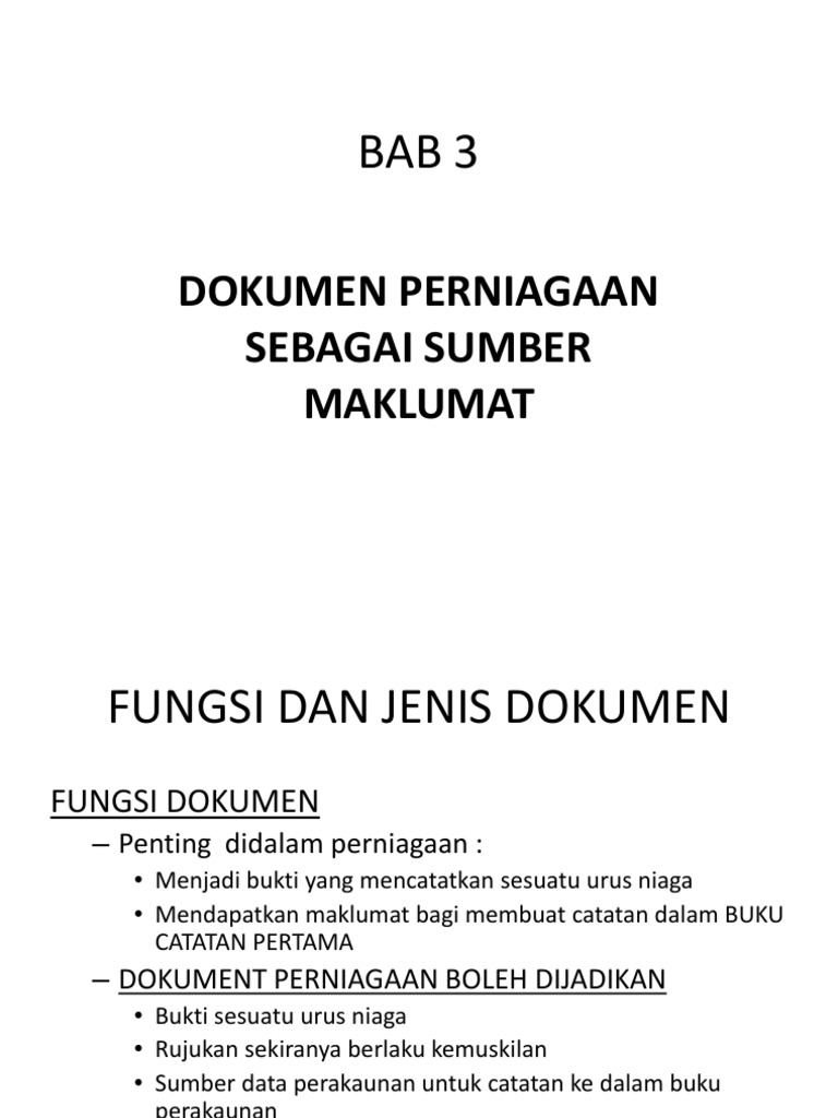 1 Sumber rekod maklumat urusniaga perniagaan- tunai atau kredit2 Bukti yang jelas dan sah di sisi undang-undang bahawa sesuatu urusniaga itu benar-benar telah berlaku3 Tiada dokumen perniagaan. BAB 3 DOKUMEN PERNIAGAAN SEBAGAI SUMBER MAKLUMAT 1. Borang Pesanan Dihantar oleh pembeli kepada penjual untuk membuat pesanan Tidak dicatat dalam mana-mana buku perakaunan.