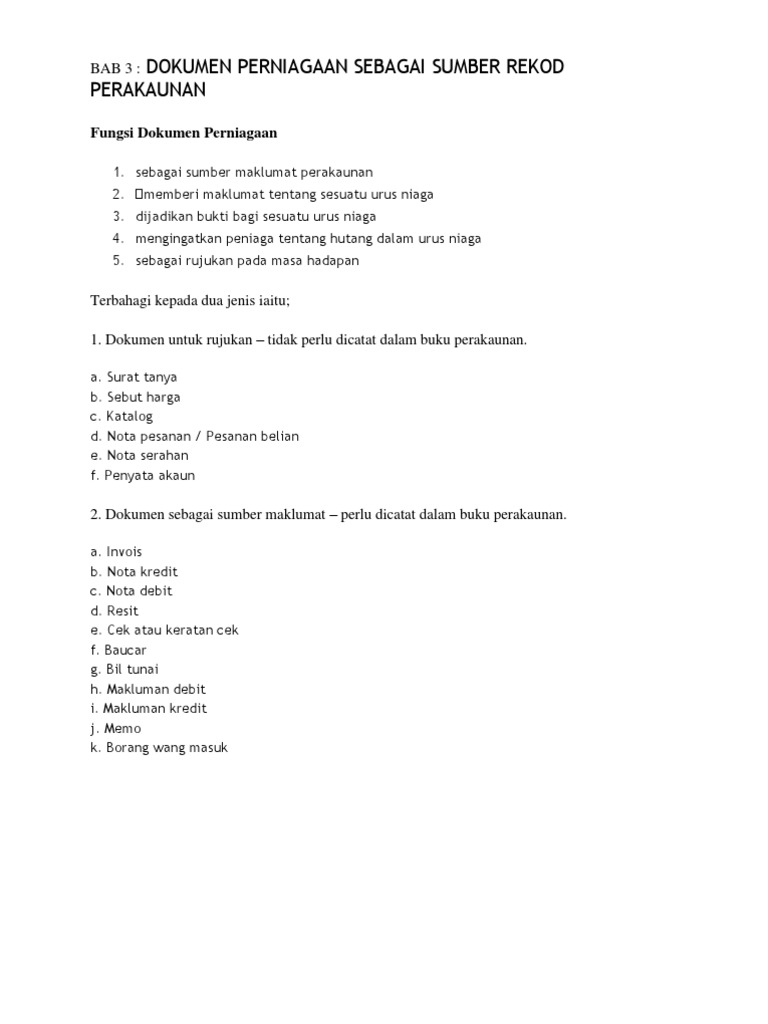 31 Jenis dan Fungsi Dokumen dalam Perniagaan. Seterusnya ialah Dokumen sebagai sumber maklumat perlu dicatat dalam perakaunan seperti INVOIS nota debit nota kredit resit cekkeratan cek baucar bil tunai makluman debit makluman kredit memo dan borang wang masuk. Pelarasan pada Tarikh Imbangan dan Penyediaan Penyata Kewangan Milikan Tunggal.