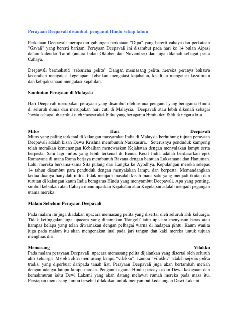 HBEF2803 Perkembangan Profesionalisme Keguruan1ISI KANDUNGANTAJUK MUKA SURAT10 Pendahuluan 320 Sejarah Deepavali 4-530 Tujuan perayaan Deepavali disambut 640 Persiapan sambutan Deepavali41 Sebelum Deepavali7-2050 Pakaian tradisonal 21-3060 Kuih muih dan juadah utamakhas 31 - 3570 Amalan-amalan yang. Padahal menurut IBT warga India di Inggris termasuk minoritas terbesar kedua. Pada hari Thaipusam bulan penuh melintasi bintang terang Pusam dalam zodiak Cancer.