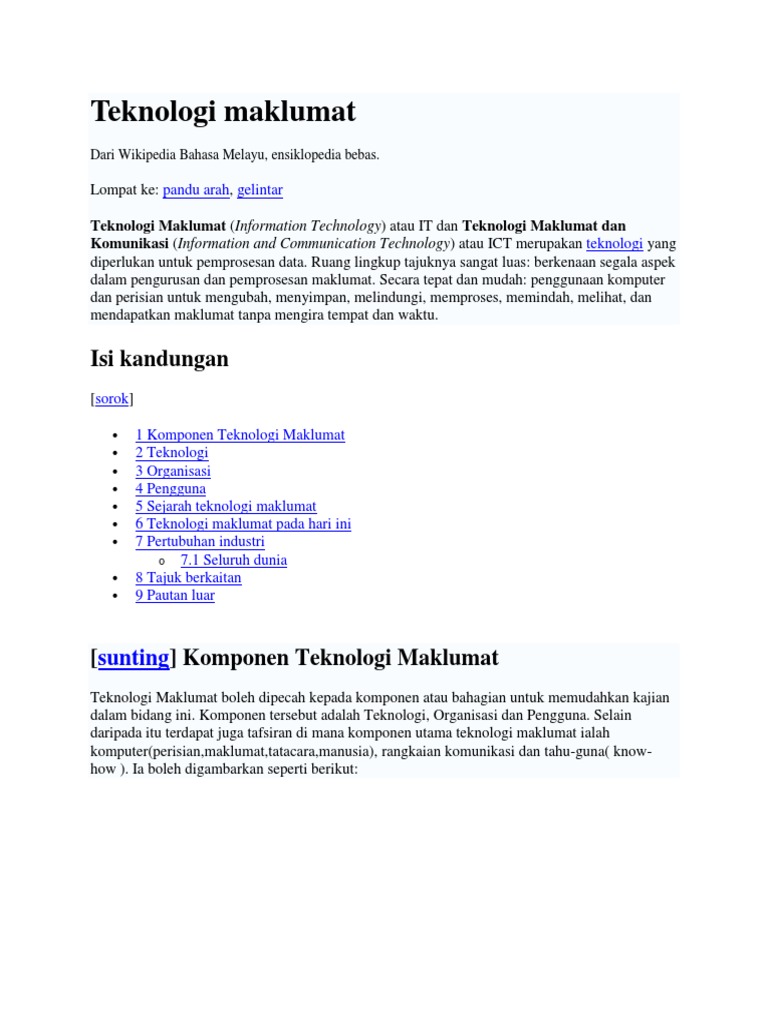 Teknologi Maklumat Information Technology atau IT dan Teknologi Maklumat dan Komunikasi Information and Communication Technology atau ICT merupakan teknologi yang diperlukan untuk pemprosesan data. Ruang lingkup tajuknya sangat luas. Butuh rujukan Apabila tidak ada bahasa verbal yang dapat dimengerti.