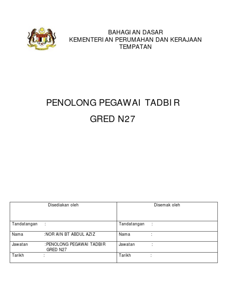 Untuk memenuhi sebahagian daripada syarat-syarat kelayakan masuk ke skim perkhidmatan Penolong Pegawai Teknologi Maklumat FA29 melalui urusan kenaikan pangkat secara lantikan. Penolong Pegawai Tadbir Gred N29. 29112018 2 Nama.