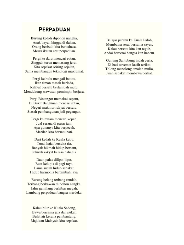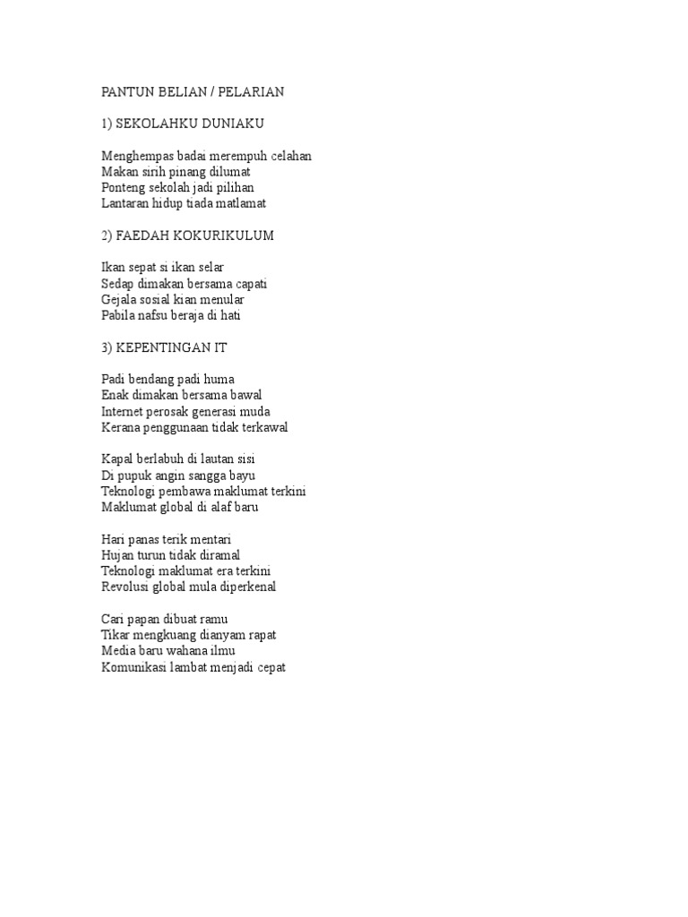 Pantun Kemerdekaan Sekolah Rendah. Pengenalan buku teks digital akan diperkenalkan di sekolah menengah terlebih dahulu kemudian di sekolah rendah. Puisi Melayu tradisional pantun soneta ulasan dan kritikan sastera haiku dan tankya cerpen drama novel bicara karya sastera PMR dan SPM madah serta berinteraksi di alam siber atas nama sastera seni dan budaya Melayu.