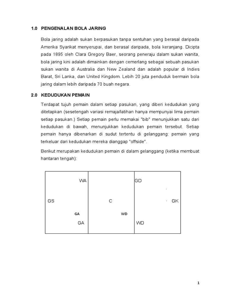 Pada awalnya permainan ini tidak mempunyai undang-undang dan tiada garisan di gelanggangGolnya pun hanya diperbuat dari tong sampah yang digantung di suatu sudut. -15 orang 1 pasukan -1 biji bola -Gelanggang bola jaring -Masa 10 minit Prosedur. Check more flip ebooks related to BOLA JARING SM of ccvui.