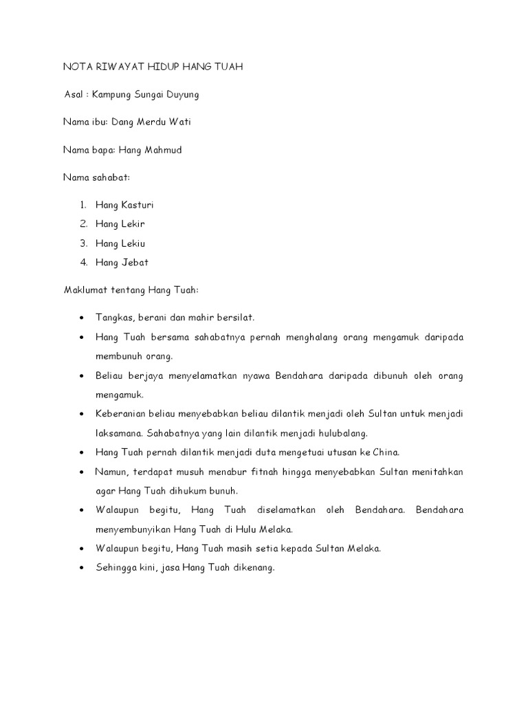 4 Murid booleh menguasai maklumat Hang Tuah. Menurut rekod sejarah beliau lahir di Kampung Sungai Duyung Melaka kira-kira dalam tahun 1444Bapanya bernama Hang Mahmud manakala ibunya pula ialah Dang Merdu Wati. It is recognised as a national literary classic which is well-known not only amongst.